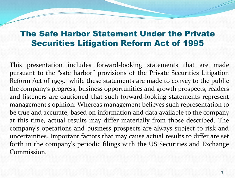 The Safe Harbor Statement Under the Private Securities Litigation Reform Act of 1995 This presentation includes forward - looking statements that are made pursuant to the “ safe harbor ” provisions of the Private Securities Litigation Reform Act of 1995 . while these statements are made to convey to the public the company ’ s progress, business opportunities and growth prospects, readers and listeners are cautioned that such forward - looking statements represent management's opinion . Whereas management believes such representation to be true and accurate, based on information and data available to the company at this time, actual results may differ materially from those described . The company's operations and business prospects are always subject to risk and uncertainties . Important factors that may cause actual results to differ are set forth in the company ’ s periodic filings with the US Securities and Exchange Commission . 1