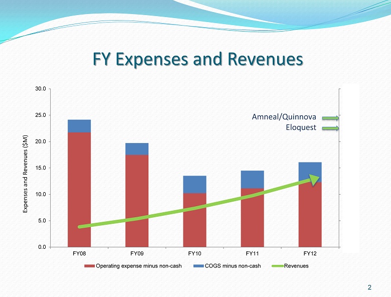 FY Expenses and Revenues 2 0.0 5.0 10.0 15.0 20.0 25.0 30.0 0.0 5.0 10.0 15.0 20.0 25.0 30.0 FY08 FY09 FY10 FY11 FY12 Expenses and Revenues ($M) Operating expense minus non-cash COGS minus non-cash Revenues Amneal/Quinnova Eloquest