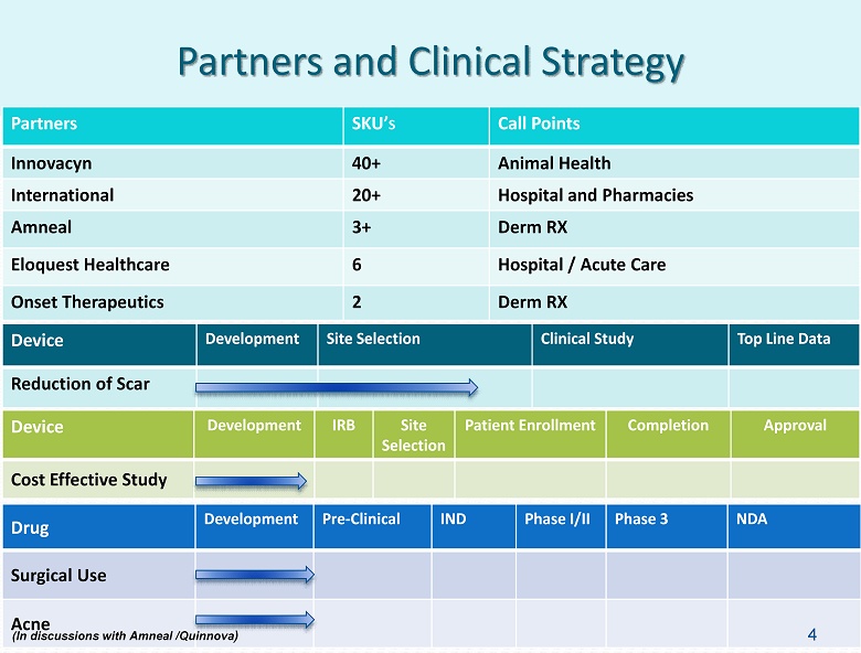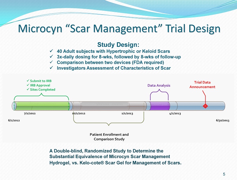 Partners and Clinical Strategy 4 Partners SKU’ S Call Points Innovacyn 40+ Animal Health International 20+ Hospital and Pharmacies Amneal 3+ Derm RX Eloquest Healthcare 6 Hospital / Acute Care Onset Therapeutics 2 Derm RX Device Development Site Selection Clinical Study Top Line Data Reduction of Scar Drug Development Pre - Clinical IND Phase I/II Phase 3 NDA Surgical Use Acne (In discussions with Amneal /Quinnova ) Device Development IRB Site Selection Pat ient Enrollment Completion Approval Cost Effective Study 4