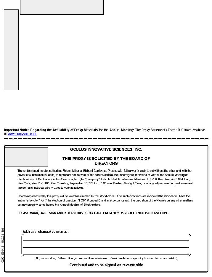 You are cordially invited to attend the 2012 Annual Meeting of Stockholders of Oculus Innovative Sciences, Inc. The meeting will be held at 10:00 a.m., Eastern Daylight Time, on Tuesday, September 11, 2012, at Marcum LLP, 750 3rd Avenue, 11th Floor, New York, NY 10017.