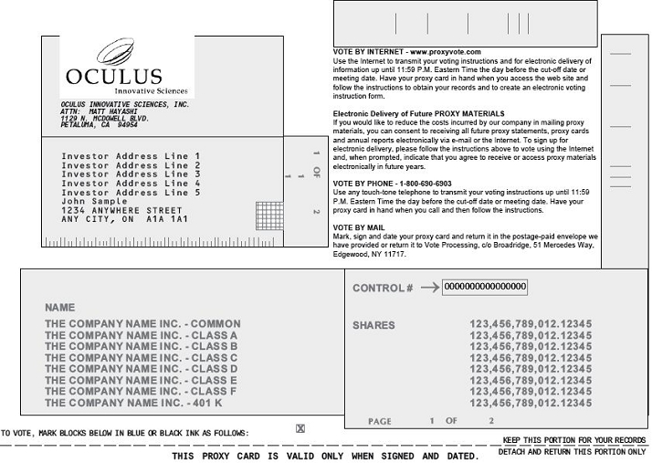 This Proxy Statement and our Annual Report for the fiscal year ended March 31, 2014, are available at http://ir.oculusis.com/annuals.cfm. You can also access these materials by scanning the QR codes on the last page of this Proxy Statement, or by contacting our Investor Relations department by email at ir@oculusis.com.