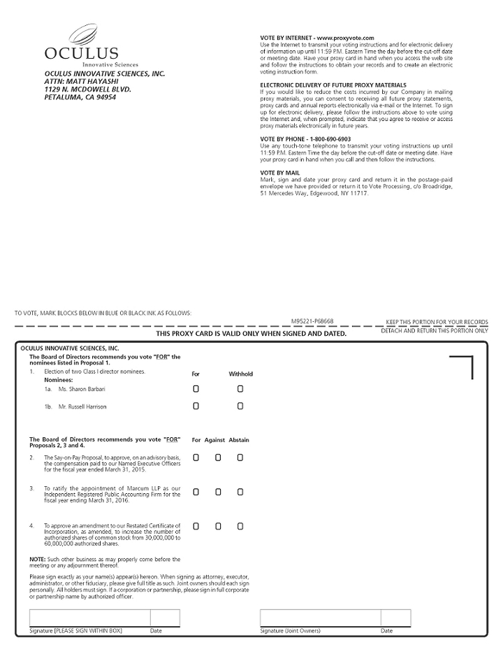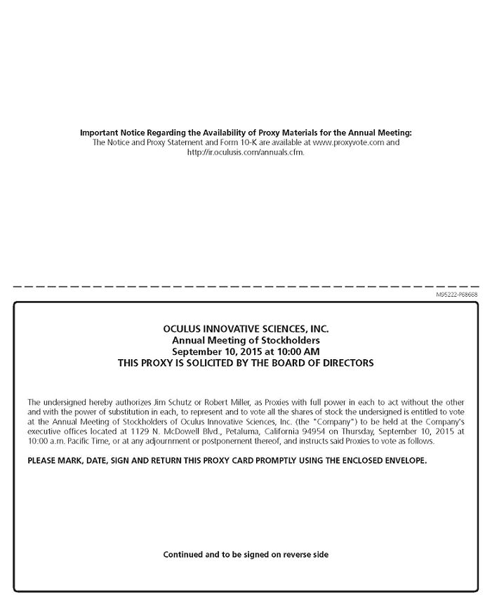 We are pleased to invite you to join our Board of Directors, senior leadership and other stockholders for our 2015 Annual Meeting of Oculus Innovative Sciences, Inc. Stockholders. The meeting will be held at our offices located at 1129 N. McDowell Blvd., in Petaluma, California 94954, at 10:00 a.m. local time on Thursday, September 10, 2015. The purposes of the meeting are: