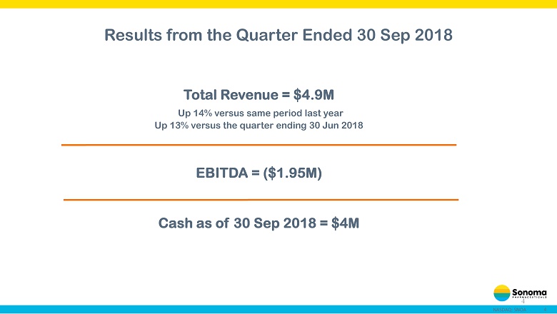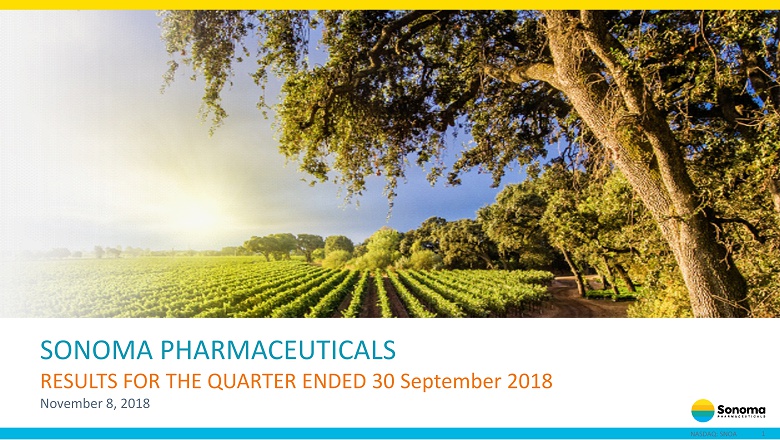 1 NASDAQ: SNOA SONOMA PHARMACEUTICALS RESULTS FOR THE QUARTER ENDED 30 September 2018 November 8, 2018