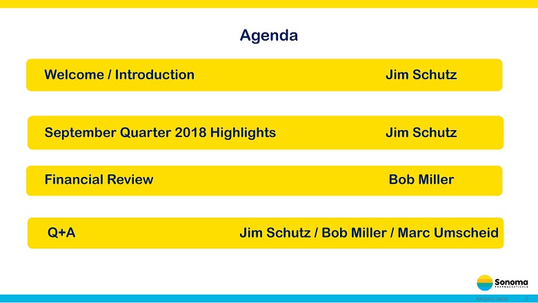 2 NASDAQ: SNOA Agenda Welcome / Introduction September Quarter 2018 Highlights Financial Review Q+A Jim Schutz Bob Miller Jim Schutz / Bob Miller / Marc Umscheid Jim Schutz