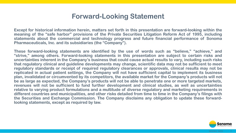 3 NASDAQ: SNOA Forward - Looking Statement Except for historical information herein, matters set forth in this presentation are forward - looking within the meaning of the “safe harbor” provisions of the Private Securities Litigation Reform Act of 1995 , including statements about the commercial and technology progress and future financial performance of Sonoma Pharmaceuticals, Inc . and its subsidiaries (the “Company”) . These forward - looking statements are identified by the use of words such as “believe,” “achieve,” and “strive,” among others . Forward - looking statements in this presentation are subject to certain risks and uncertainties inherent in the Company’s business that could cause actual results to vary, including such risks that regulatory clinical and guideline developments may change, scientific data may not be sufficient to meet regulatory standards or receipt of required regulatory clearances or approvals, clinical results may not be replicated in actual patient settings, the Company will not have sufficient capital to implement its business plan, invalidated or circumvented by its competitors, the available market for the Company’s products will not be as large as expected, the Company’s products will not be able to penetrate one or more targeted markets, revenues will not be sufficient to fund further development and clinical studies, as well as uncertainties relative to varying product formulations and a multitude of diverse regulatory and marketing requirements in different countries and municipalities, and other risks detailed from time to time in the Company’s filings with the Securities and Exchange Commission . The Company disclaims any obligation to update these forward - looking statements, except as required by law .