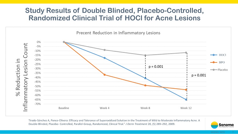 7 NASDAQ: SNOA Tirado - Sánchez A, Ponce - Olivera : Efficacy and Tolerance of Superoxidized Solution in the Treatment of Mild to Moderate Inflammatory Acne. A Double - Blinded, Placebo - Controlled, Parallel - Group, Randomized, Clinical Trial.” J Derm Treatment 20, (5) 289 – 292, 2009. Study Results of Double Blinded, Placebo - Controlled, Randomized Clinical Trial of HOCl for Acne Lesions HOCl BPO