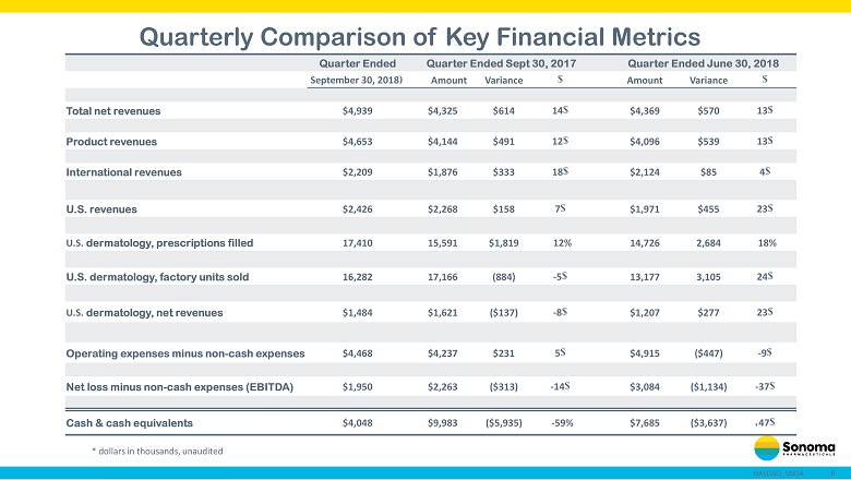 8 NASDAQ: SNOA Quarterly Comparison of Key Financial Metrics Quarter Ended Quarter Ended Sept 30 , 2017 Quarter Ended June 30 , 2018 September 30 , 2018 Amount Variance Amount Variance Total net revenues $4,939 $4,325 $614 14 $4,369 $570 13 Product revenues $4,653 $4,144 $491 12 $4,096 $539 13 International revenues $2,209 $1,876 $333 18 $2,124 $85 4 U.S. revenues $2,426 $2,268 $158 7 $1,971 $455 23 U.S. dermatology, prescriptions filled 17,410 15,591 $1,819 12% 14,726 2,684 18% U.S. dermatology, factory units sold 16,282 17,166 (884) - 5 13,177 3,105 24 U.S. dermatology, net revenues $1,484 $1,621 ($137) - 8 $1,207 $277 23 Operating expenses minus non - cash expenses $4,468 $4,237 $231 5 $4,915 ($447) - 9 Net loss minus non - cash expenses (EBITDA) $1,950 $2,263 ($313) - 14 $3,084 ($1,134) - 37 Cash & cash equivalents $4,048 $9,983 ($5,935) - 59% $7,685 ($3,637) 47 * dollars in thousands, unaudited