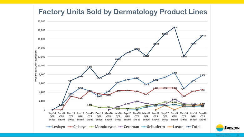 9 NASDAQ: SNOA 0 1,106 2,724 3,361 4,059 3,769 4,809 5,793 6,648 5,659 5,446 6,728 7,174 6,804 5,319 6,146 7,968 0 39 1,043 2,305 3,103 2,833 3,339 4,275 4,341 3,425 3,253 4,053 4,348 4,218 3,466 3,785 4,879 0 134 476 635 526 625 970 1,326 1,771 1,916 1,491 1,514 920 0 1,084 1,725 1,656 1,381 1,294 1,358 2,113 1,664 1,440 1,449 0 75 635 1,019 939 1,014 817 791 867 0 57 911 1,050 1,327 0 1,145 3,767 5,666 7,162 6,736 8,624 11,787 13,240 11,439 11,684 14,421 15,591 16,122 13,667 14,726 17,410 0 2,000 4,000 6,000 8,000 10,000 12,000 14,000 16,000 18,000 20,000 Sep-14 QTR Ended Dec-14 QTR Ended Mar-15 QTR Ended Jun-15 QTR Ended Sep-15 QTR Ended Dec-15 QTR Ended Mar-16 QTR Ended Jun-16 QTR Ended Sep-16 QTR Ended Dec-16 QTR Ended Mar-17 QTR Ended Jun-17 QTR Ended Sep-17 QTR Ended Dec-17 QTR Ended Mar-18 QTR Ended Jun-18 QTR Ended Sep-18 QTR Ended Total Dispensed Prescriptions Levicyn Celacyn Mondoxyne Ceramax Sebuderm Loyon Total Prescriptions Filled by Dermatology Product Lines (IMS)