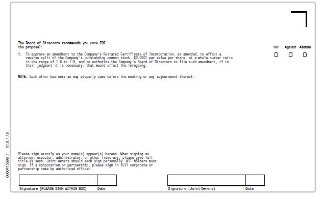 | 1. | To (i) approve an amendment to the Company’s Restated Certificate of Incorporation, as amended, and authorize the Company’s Board of Directors, if in their judgment it is necessary, to effect a reverse stock split of the Company’s outstanding common stock, $0.0001 par value per share, at a whole number ratio in the range of 1-for-6 to 1-for-9, such ratio to be determined in the discretion of the Company’s Board of Directors, and to (ii) authorize the Company’s Board of Directors to file such amendment, if in their judgment it is necessary, that would effect the foregoing; and |