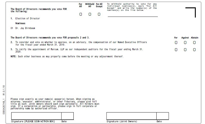 | · | To consider and vote on whether to approve, on an advisory, the compensation of our Named Executive Officers for the fiscal year ended March 31, 2019; |