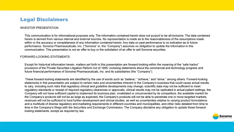 Legal Disclaimers INVESTOR PRESENTATION This communication is for informational purposes only. The information contained herein does not purport to be all - inclusive. T he data contained herein is derived from various internal and external sources. No representation is made as to the reasonableness of the assum pti ons made within or the accuracy or completeness of any information contained herein. Any data on past performance is no indication as to future performance. Sonoma Pharmaceuticals, Inc. (“Sonoma” or, the “Company”) assumes no obligation to update the information in thi s communication. This presentation is not an offer to buy or the solicitation of an offer to sell Sonoma securities. FORWARD - LOOKING STATEMENTS Except for historical information herein, matters set forth in this presentation are forward - looking within the meaning of the “safe harbor” provisions of the Private Securities Litigation Reform Act of 1995, including statements about the commercial and technology pro gress and future financial performance of Sonoma Pharmaceuticals, Inc. and its subsidiaries (the “Company”). These forward - looking statements are identified by the use of words such as “believe,” “achieve,” and “strive,” among othe rs. Forward - looking statements in this presentation are subject to certain risks and uncertainties inherent in the Company’s business that could cau se actual results to vary, including such risks that regulatory clinical and guideline developments may change, scientific data may not be suff ici ent to meet regulatory standards or receipt of required regulatory clearances or approvals, clinical results may not be replicated in act ual patient settings, the Company will not have sufficient capital to implement its business plan, invalidated or circumvented by its competitors, the ava ilable market for the Company’s products will not be as large as expected, the Company’s products will not be able to penetrate one or more tar get ed markets, revenues will not be sufficient to fund further development and clinical studies, as well as uncertainties relative to varyin g p roduct formulations and a multitude of diverse regulatory and marketing requirements in different countries and municipalities, and other risks d eta iled from time to time in the Company’s filings with the Securities and Exchange Commission. The Company disclaims any obligation to update the se forward - looking statements, except as required by law.