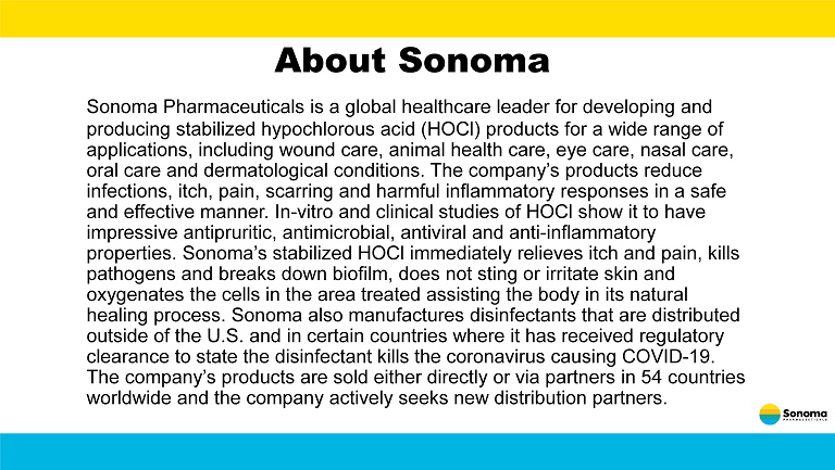 About Sonoma Sonoma Pharmaceuticals is a global healthcare leader for developing and producing stabilized hypochlorous acid ( HOCl ) products for a wide range of applications, including wound care, animal health care, eye care, nasal care, oral care and dermatological conditions. The company’s products reduce infections, itch, pain, scarring and harmful inflammatory responses in a safe and effective manner. In - vitro and clinical studies of HOCl show it to have impressive antipruritic, antimicrobial, antiviral and anti - inflammatory properties. Sonoma’s stabilized HOCl immediately relieves itch and pain, kills pathogens and breaks down biofilm, does not sting or irritate skin and oxygenates the cells in the area treated assisting the body in its natural healing process. Sonoma also manufactures disinfectants that are distributed outside of the U.S. and in certain countries where it has received regulatory clearance to state the disinfectant kills the coronavirus causing COVID - 19. The company’s products are sold either directly or via partners in 54 countries worldwide and the company actively seeks new distribution partners.