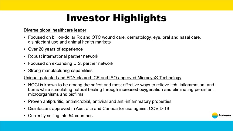 Investor Highlights Diverse global healthcare leader • Focused on billion - dollar Rx and OTC wound care, dermatology, eye, oral and nasal care, disinfectant use and animal health markets • Over 20 years of experience • Robust international partner network • Focused on expanding U.S. partner network • Strong manufacturing capabilities Unique, patented and FDA - cleared, CE and ISO approved Microcyn® Technology • HOCl is known to be among the safest and most effective ways to relieve itch, inflammation, and burns while stimulating natural healing through increased oxygenation and eliminating persistent microorganisms and biofilms • Proven antipruritic, antimicrobial, antiviral and anti - inflammatory properties • Disinfectant approved in Australia and Canada for use against COVID - 19 • Currently selling into 54 countries