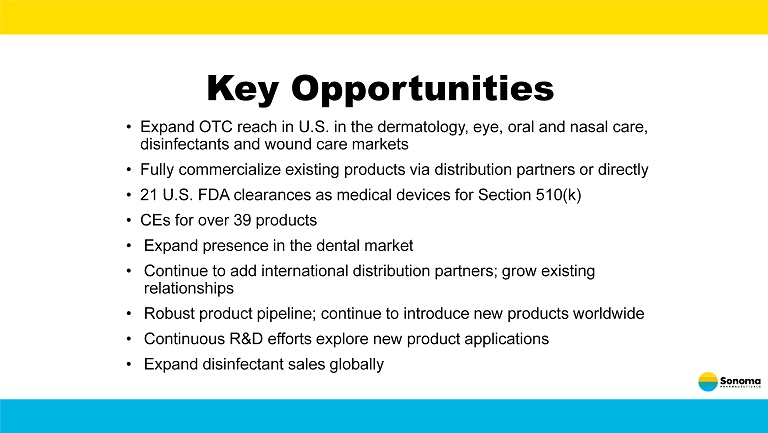 Key Opportunities • Expand OTC reach in U.S. in the dermatology, eye, oral and nasal care, disinfectants and wound care markets • Fully commercialize existing products via distribution partners or directly • 21 U.S. FDA clearances as medical devices for Section 510(k) • CEs for over 39 products • Expand presence in the dental market • Continue to add international distribution partners; grow existing relationships • Robust product pipeline; continue to introduce new products worldwide • Continuous R&D efforts explore new product applications • Expand disinfectant sales globally