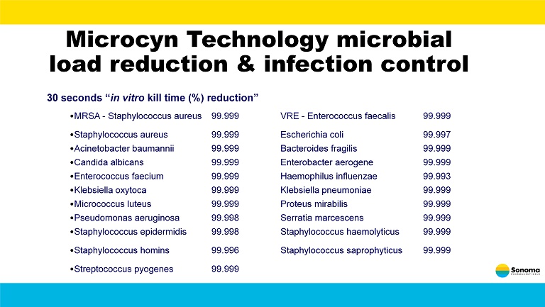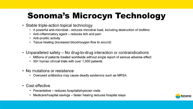 Sonoma’s Microcyn Technology • Stable triple - action topical technology • A powerful anti - microbial - reduces microbial load, including destruction of biofilms • Anti - inflammatory agent – reduces itch and pain • Anti - pruritic activity • Tissue healing (increased blood/oxygen flow to wound) • Unparalleled safety – No drug - to - drug interaction or contraindications • Millions of patients treated worldwide without single report of serious adverse effect • 30+ human clinical trials with over 1,500 patients • No mutations or resistance • Overused antibiotics may cause deadly epidemics such as MRSA • Cost effective • Preventative – reduces hospital/physician visits • Medicare/hospital savings – faster healing reduces hospital stays