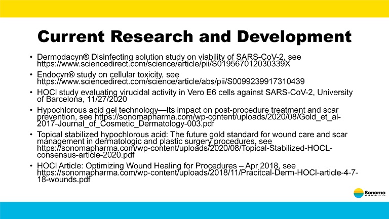 Current Research and Development • Dermodacyn ® Disinfecting solution study on viability of SARS - CoV - 2, see https://www.sciencedirect.com/science/article/pii/S019567012030339X • Endocyn ® study on cellular toxicity, see https://www.sciencedirect.com/science/article/abs/pii/S0099239917310439 • HOCl study evaluating virucidal activity in Vero E6 cells against SARS - CoV - 2, University of Barcelona, 11/27/2020 • Hypochlorous acid gel technology — Its impact on post - procedure treatment and scar prevention, see https://sonomapharma.com/wp - content/uploads/2020/08/Gold_et_al - 2017 - Journal_of_Cosmetic_Dermatology - 003.pdf • Topical stabilized hypochlorous acid: The future gold standard for wound care and scar management in dermatologic and plastic surgery procedures, see https://sonomapharma.com/wp - content/uploads/2020/08/Topical - Stabilized - HOCL - consensus - article - 2020.pdf • HOCl Article: Optimizing Wound Healing for Procedures – Apr 2018, see https://sonomapharma.com/wp - content/uploads/2018/11/Pracitcal - Derm - HOCl - article - 4 - 7 - 18 - wounds.pdf