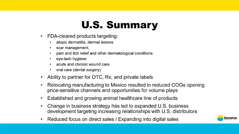 U.S. Summary • FDA - cleared products targeting: • atopic dermatitis, dermal lesions • scar management, • pain and itch relief and other dermatological conditions • eye - lash hygiene • acute and chronic wound care • oral care (dental surgery) • Ability to partner for OTC, Rx, and private labels • Relocating manufacturing to Mexico resulted in reduced COGs opening price - sensitive channels and opportunities for volume plays • Established and growing animal healthcare line of products • Change in business strategy has led to expanded U.S. business development targeting increasing relationships with U.S. distributors • Reduced focus on direct sales / Expanding into digital sales