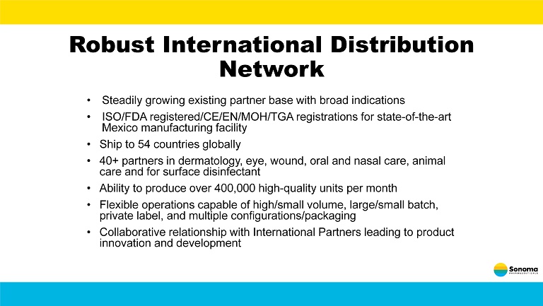 Robust International Distribution Network • Steadily growing existing partner base with broad indications • ISO/FDA registered/CE/EN/MOH/TGA registrations for state - of - the - art Mexico manufacturing facility • Ship to 54 countries globally • 40+ partners in dermatology, eye, wound, oral and nasal care, animal care and for surface disinfectant • Ability to produce over 400,000 high - quality units per month • Flexible operations capable of high/small volume, large/small batch, private label, and multiple configurations/packaging • Collaborative relationship with International Partners leading to product innovation and development