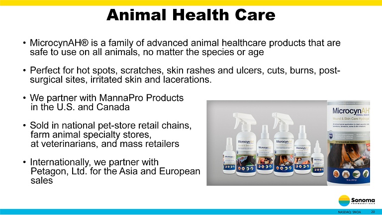 20 NASDAQ: SNOA Animal Health Care • MicrocynAH ® is a family of advanced animal healthcare products that are safe to use on all animals, no matter the species or age • Perfect for hot spots, scratches, skin rashes and ulcers, cuts, burns, post - surgical sites, irritated skin and lacerations. • We partner with MannaPro Products in the U.S. and Canada • Sold in national pet - store retail chains, farm animal specialty stores, at veterinarians, and mass retailers • Internationally, we partner with Petagon , Ltd. for the Asia and European sales