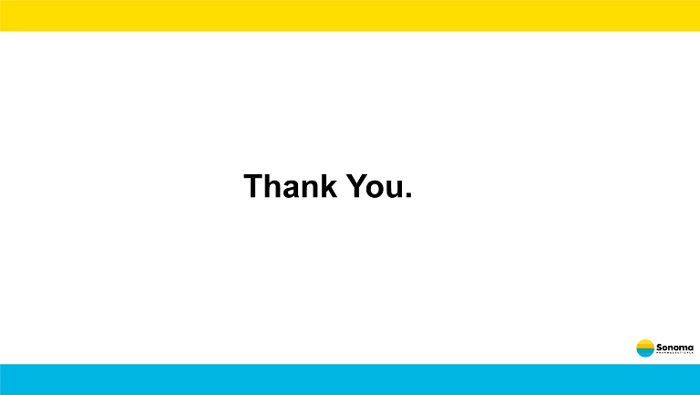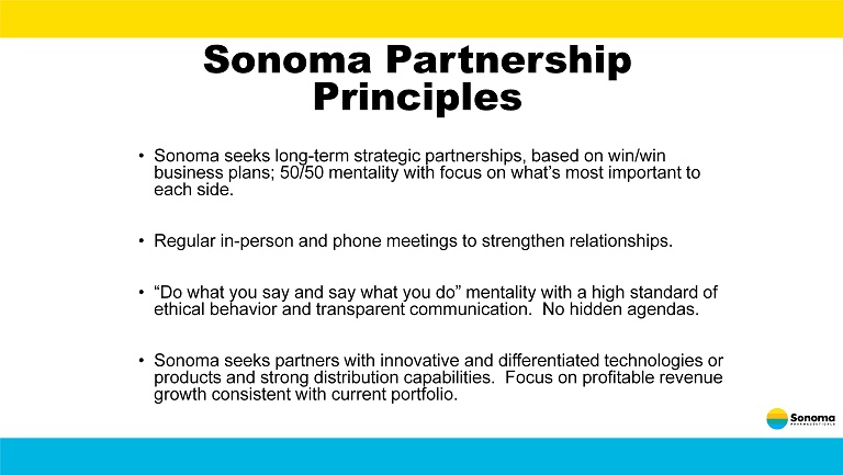 Sonoma Partnership Principles • Sonoma seeks long - term strategic partnerships, based on win/win business plans; 50/50 mentality with focus on what’s most important to each side. • Regular in - person and phone meetings to strengthen relationships. • “Do what you say and say what you do” mentality with a high standard of ethical behavior and transparent communication. No hidden agendas. • Sonoma seeks partners with innovative and differentiated technologies or products and strong distribution capabilities. Focus on profitable revenue growth consistent with current portfolio.