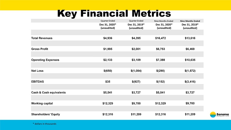 Key Financial Metrics Quarter Ended Quarter Ended Nine Months Ended Nine Months Ended Dec 31 , 2020* (unaudited) Dec 31, 2019* (unaudited) Dec 31, 2020* (unaudited) Dec 31, 2019* (unaudited) Total Revenues $4,936 $4,395 $16,472 $13,616 Gross Profit $1,995 $2,001 $6,753 $6,469 Operating Expenses $2,133 $3,109 $7,388 $10,635 Net Loss $(650) $(1,084) $(290) $(1,572) EBITDAS $35 $(927) $(152) $(3,416) Cash & Cash equivalents $5,541 $3,727 $5,541 $3,727 Working capital $12,329 $9,700 $12,329 $9,700 Shareholders’ Equity $12,316 $11,209 $12,316 $11,209 * dollars in thousands