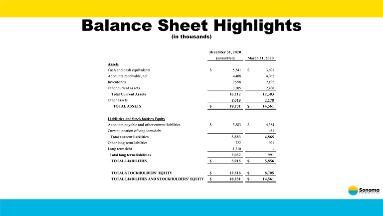 Balance Sheet Highlights (in thousands) December 31, 2020 (unaudited) March 31, 2020 Assets Cash and cash equivalents 5,541$ 3,691$ Accounts receivable, net 4,408 4,062 Inventories 2,958 2,192 Other current assets 3,305 2,438 Total Current Assets 16,212 12,383 Other assets 2,019 2,178 TOTAL ASSETS 18,231$ 14,561$ Liabilities and Stockholders Equity Accounts payable and other current liabilities 3,883$ 4,384$ Current portion of long term debt - 481 Total current liabilities 3,883 4,865 Other long term liabilities 722 991 Long term debt 1,310 - Total long term liabilities 2,032 991 TOTAL LIABILITIES 5,915$ 5,856$ TOTAL STOCKHOLDERS' EQUITY 12,316$ 8,705$ TOTAL LIABILITIES AND STOCKHOLDERS' EQUITY 18,231$ 14,561$