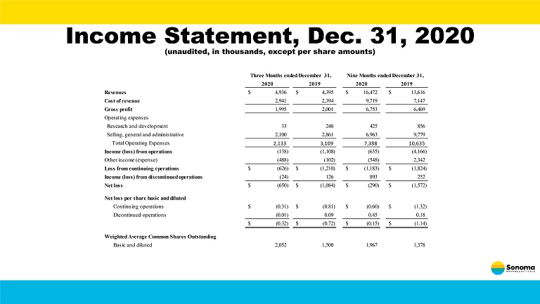 Income Statement, Dec. 31, 2020 (unaudited, in thousands, except per share amounts) 2020 2019 2020 2019 Revenues 4,936$ 4,395$ 16,472$ 13,616$ Cost of revenue 2,941 2,394 9,719 7,147 Gross profit 1,995 2,001 6,753 6,469 Operating expenses Research and development 33 248 425 856 Selling, general and administrative 2,100 2,861 6,963 9,779 Total Operating Expenses 2,133 3,109 7,388 10,635 Income (loss) from operations (138) (1,108) (635) (4,166) Other income (expense) (488) (102) (548) 2,342 Loss from continuing cperations (626)$ (1,210)$ (1,183)$ (1,824)$ Income (loss) from discontinued operations (24) 126 893 252 Net loss (650)$ (1,084)$ (290)$ (1,572)$ Net loss per share basic and diluted Continuing operations (0.31)$ (0.81)$ (0.60)$ (1.32)$ Dicontinued operations (0.01) 0.09 0.45 0.18 (0.32)$ (0.72)$ (0.15)$ (1.14)$ Weighted Average Common Shares Outstanding Basic and diluted 2,052 1,500 1,967 1,378 Three Months ended December 31, Nine Months ended December 31,