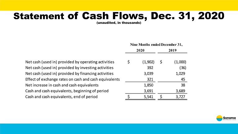 Statement of Cash Flows, Dec. 31, 2020 (unaudited, in thousands) 2020 2019 Net cash (used in) provided by operating activities (1,902)$ (1,000)$ Net cash (used in) provided by investing activities 392 (36) Net cash (used in) provided by financing activities 3,039 1,029 Effect of exchange rates on cash and cash equivalents 321 45 Net increase in cash and cash equivalents 1,850 38 Cash and cash equivalents, beginning of period 3,691 3,689 Cash and cash equivalents, end of period 5,541$ 3,727$ Nine Months ended December 31,