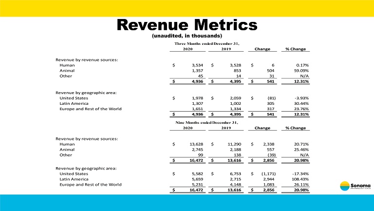 Revenue Metrics (unaudited, in thousands) 2020 2019 Change % Change Revenue by revenue sources: Human 3,534$ 3,528$ 6$ 0.17% Animal 1,357 853 504 59.09% Other 45 14 31 N/A 4,936$ 4,395$ 541$ 12.31% Revenue by geographic area: United States 1,978$ 2,059$ (81)$ -3.93% Latin America 1,307 1,002 305 30.44% Europe and Rest of the World 1,651 1,334 317 23.76% 4,936$ 4,395$ 541$ 12.31% 2020 2019 Change % Change Revenue by revenue sources: Human 13,628$ 11,290$ 2,338$ 20.71% Animal 2,745 2,188 557 25.46% Other 99 138 (39) N/A 16,472$ 13,616$ 2,856$ 20.98% Revenue by geographic area: United States 5,582$ 6,753$ (1,171)$ -17.34% Latin America 5,659 2,715 2,944 108.43% Europe and Rest of the World 5,231 4,148 1,083 26.11% 16,472$ 13,616$ 2,856$ 20.98% Three Months ended December 31, Nine Months ended December 31,