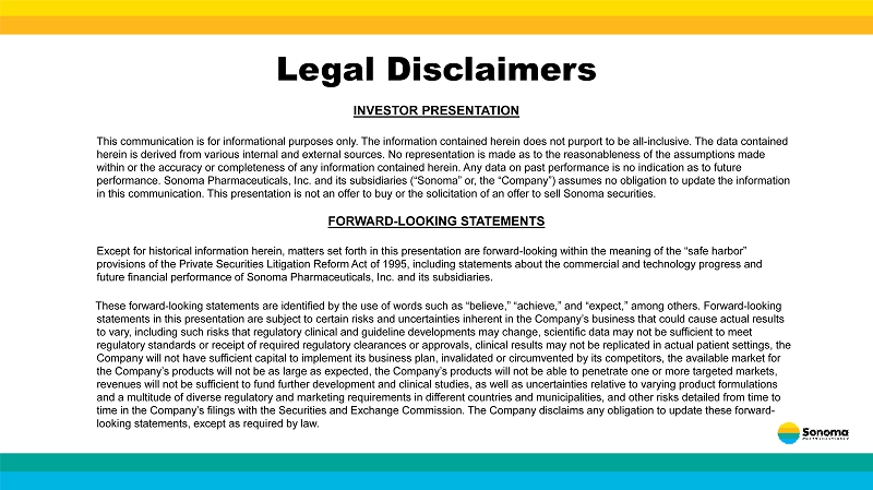 Legal Disclaimers INVESTOR PRESENTATION This communication is for informational purposes only. The information contained herein does not purport to be all - inclusive. T he data contained herein is derived from various internal and external sources. No representation is made as to the reasonableness of the assum pti ons made within or the accuracy or completeness of any information contained herein. Any data on past performance is no indication as to future performance. Sonoma Pharmaceuticals, Inc. and its subsidiaries (“Sonoma” or, the “Company”) assumes no obligation to update t he information in this communication. This presentation is not an offer to buy or the solicitation of an offer to sell Sonoma securities. FORWARD - LOOKING STATEMENTS Except for historical information herein, matters set forth in this presentation are forward - looking within the meaning of the “safe harbor” provisions of the Private Securities Litigation Reform Act of 1995, including statements about the commercial and technology pro gress and future financial performance of Sonoma Pharmaceuticals, Inc. and its subsidiaries. These forward - looking statements are identified by the use of words such as “believe,” “achieve,” and “expect,” among other s. Forward - looking statements in this presentation are subject to certain risks and uncertainties inherent in the Company’s business that could cau se actual results to vary, including such risks that regulatory clinical and guideline developments may change, scientific data may not be suff ici ent to meet regulatory standards or receipt of required regulatory clearances or approvals, clinical results may not be replicated in act ual patient settings, the Company will not have sufficient capital to implement its business plan, invalidated or circumvented by its competitors, the ava ilable market for the Company’s products will not be as large as expected, the Company’s products will not be able to penetrate one or more tar get ed markets, revenues will not be sufficient to fund further development and clinical studies, as well as uncertainties relative to varyin g p roduct formulations and a multitude of diverse regulatory and marketing requirements in different countries and municipalities, and other risks d eta iled from time to time in the Company’s filings with the Securities and Exchange Commission. The Company disclaims any obligation to update the se forward - looking statements, except as required by law.