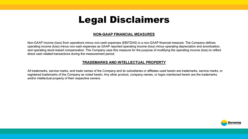 NON - GAAP FINANCIAL MEASURES Non - GAAP income (loss) from operations minus non - cash expenses (EBITDAS) is a non - GAAP financial measure. The Company defines operating income (loss) minus non - cash expenses as GAAP reported operating income (loss) minus operating depreciation and amorti zation, and operating stock - based compensation. The Company uses this measure for the purpose of modifying the operating income (loss) t o reflect direct cash related transactions during the measurement period. TRADEMARKS AND INTELLECTUAL PROPERTY All trademarks, service marks, and trade names of the Company and its subsidiaries or affiliates used herein are trademarks, se rvice marks, or registered trademarks of the Company as noted herein. Any other product, company names, or logos mentioned herein are the tra dem arks and/or intellectual property of their respective owners. Legal Disclaimers