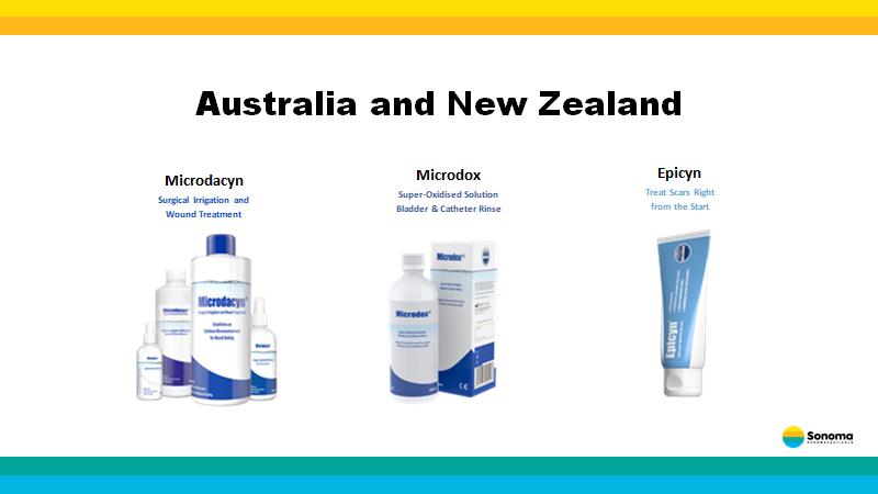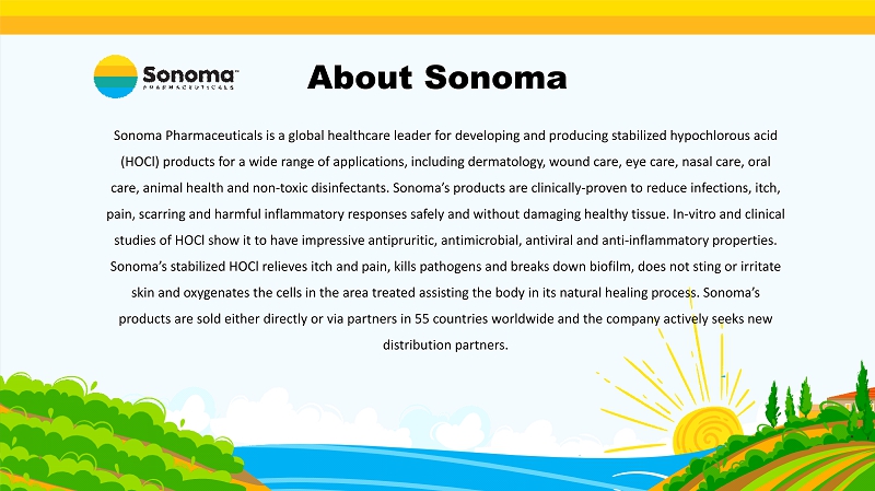 Sonoma Pharmaceuticals is a global healthcare leader for developing and producing stabilized hypochlorous acid ( HOCl ) products for a wide range of applications, including dermatology, wound care, eye care, nasal care, oral care, animal health and non - toxic disinfectants. Sonoma’s products are clinically - proven to reduce infections, itch, pain, scarring and harmful inflammatory responses safely and without damaging healthy tissue. In - vitro and clinical studies of HOCl show it to have impressive antipruritic, antimicrobial, antiviral and anti - inflammatory properties. Sonoma’s stabilized HOCl relieves itch and pain, kills pathogens and breaks down biofilm, does not sting or irritate skin and oxygenates the cells in the area treated assisting the body in its natural healing process. Sonoma’s products are sold either directly or via partners in 55 countries worldwide and the company actively seeks new distribution partners. About Sonoma
