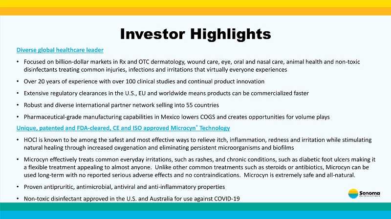 Investor Highlights Diverse global healthcare leader • Focused on billion - dollar markets in Rx and OTC dermatology, wound care, eye, oral and nasal care, animal health and non - toxic disinfectants treating common injuries, infections and irritations that virtually everyone experiences • Over 20 years of experience with over 100 clinical studies and continual product innovation • Extensive regulatory clearances in the U.S., EU and worldwide means products can be commercialized faster • Robust and diverse international partner network selling into 55 countries • Pharmaceutical - grade manufacturing capabilities in Mexico lowers COGS and creates opportunities for volume plays Unique, patented and FDA - cleared, CE and ISO approved Microcyn ® Technology • HOCl is known to be among the safest and most effective ways to relieve itch, inflammation, redness and irritation while stim ula ting natural healing through increased oxygenation and eliminating persistent microorganisms and biofilms • Microcyn effectively treats common everyday irritations, such as rashes, and chronic conditions, such as diabetic foot ulcers making i t a flexible treatment appealing to almost anyone. Unlike other common treatments such as steroids or antibiotics, Microcyn can be used long - term with no reported serious adverse effects and no contraindications. Microcyn is extremely safe and all - natural. • Proven antipruritic, antimicrobial, antiviral and anti - inflammatory properties • Non - toxic disinfectant approved in the U.S. and Australia for use against COVID - 19