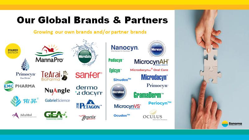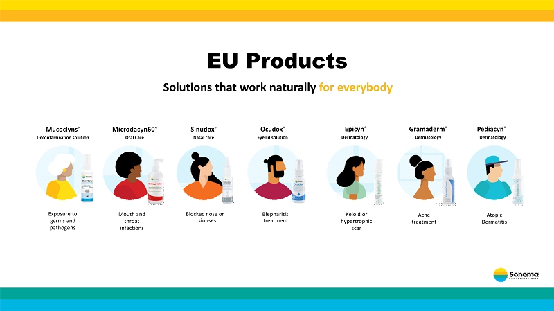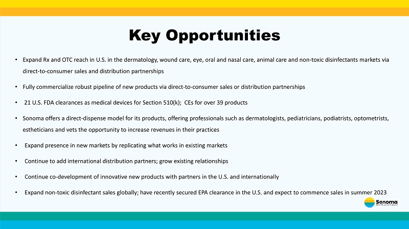 • Expand Rx and OTC reach in U.S. in the dermatology, wound care, eye, oral and nasal care, animal care and non - toxic disinfectant s markets via direct - to - consumer sales and distribution partnerships • Fully commercialize robust pipeline of new products via direct - to - consumer sales or distribution partnerships • 21 U.S. FDA clearances as medical devices for Section 510(k); CEs for over 39 products • Sonoma offers a direct - dispense model for its products, offering professionals such as dermatologists, pediatricians, podiatrist s, optometrists, estheticians and vets the opportunity to increase revenues in their practices • Expand presence in new markets by replicating what works in existing markets • Continue to add international distribution partners; grow existing relationships • Continue co - development of innovative new products with partners in the U.S. and internationally • Expand non - toxic disinfectant sales globally; have recently secured EPA clearance in the U.S. and expect to commence sales in su mmer 2023 Key Opportunities