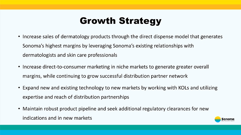 • Increase sales of dermatology products through the direct dispense model that generates Sonoma’s highest margins by leveraging Sonoma’s existing relationships with dermatologists and skin care professionals • Increase direct - to - consumer marketing in niche markets to generate greater overall margins, while continuing to grow successful distribution partner network • Expand new and existing technology to new markets by working with KOLs and utilizing expertise and reach of distribution partnerships • Maintain robust product pipeline and seek additional regulatory clearances for new indications and in new markets Growth Strategy