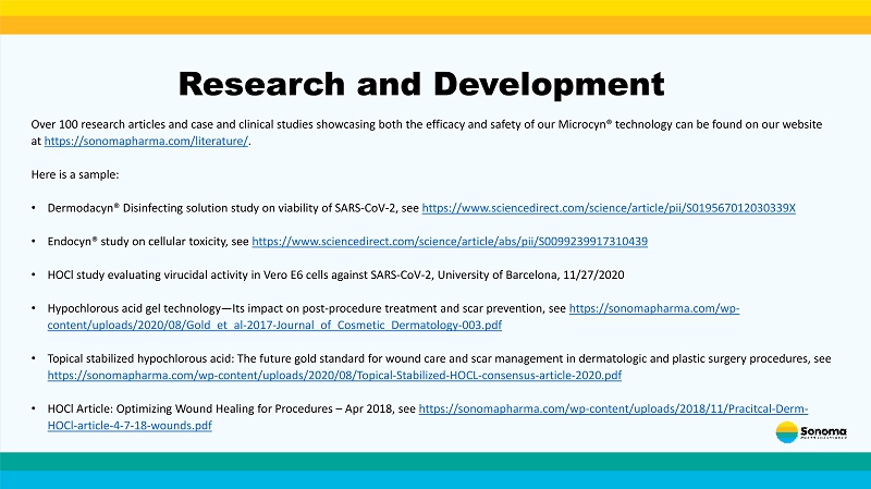 Research and Development Over 100 research articles and case and clinical studies showcasing both the efficacy and safety of our Microcyn ® technology can be found on our website at https://sonomapharma.com/literature/ . Here is a sample: • Dermodacyn ® Disinfecting solution study on viability of SARS - CoV - 2, see https://www.sciencedirect.com/science/article/pii/S019567012030339X • Endocyn ® study on cellular toxicity, see https://www.sciencedirect.com/science/article/abs/pii/S0099239917310439 • HOCl study evaluating virucidal activity in Vero E6 cells against SARS - CoV - 2, University of Barcelona, 11/27/2020 • Hypochlorous acid gel technology — Its impact on post - procedure treatment and scar prevention, see https://sonomapharma.com/wp - content/uploads/2020/08/Gold_et_al - 2017 - Journal_of_Cosmetic_Dermatology - 003.pdf • Topical stabilized hypochlorous acid: The future gold standard for wound care and scar management in dermatologic and plastic su rgery procedures, see https://sonomapharma.com/wp - content/uploads/2020/08/Topical - Stabilized - HOCL - consensus - article - 2020.pdf • HOCl Article: Optimizing Wound Healing for Procedures – Apr 2018, see https://sonomapharma.com/wp - content/uploads/2018/11/Pracitcal - Derm - HOCl - article - 4 - 7 - 18 - wounds.pdf