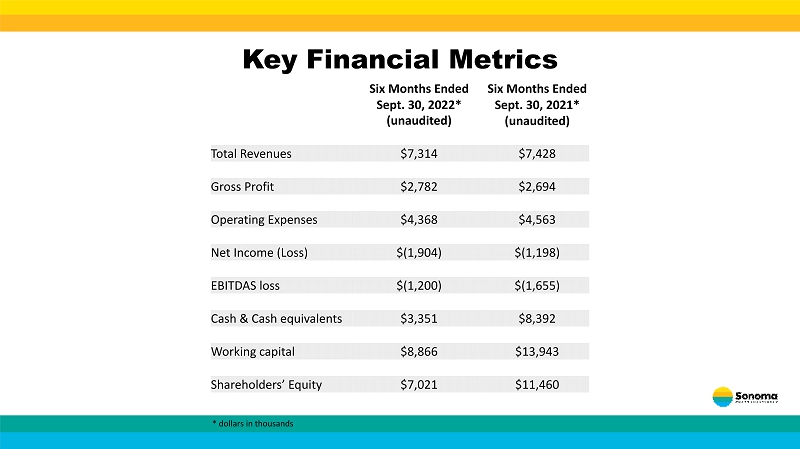 Key Financial Metrics * dollars in thousands Six Months Ended Six Months Ended Sept. 30, 2022 * (unaudited) Sept. 30, 2021* (unaudited) Total Revenues $7,314 $7,428 Gross Profit $2,782 $2,694 Operating Expenses $4,368 $4,563 Net Income (Loss) $(1,904) $(1,198) EBITDAS loss $(1,200) $(1,655) Cash & Cash equivalents $3,351 $8,392 Working capital $8,866 $13,943 Shareholders’ Equity $7,021 $11,460