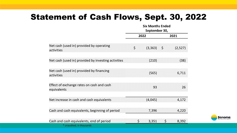 Statement of Cash Flows, Sept. 30, 2022 Six Months Ended September 30, 2022 2021 Net cash (used in) provided by operating activities $ (3,363) $ (2,527) Net cash (used in) provided by investing activities (210) (38) Net cash (used in) provided by financing activities (565) 6,711 Effect of exchange rates on cash and cash equivalents 93 26 Net increase in cash and cash equivalents (4,045) 4,172 Cash and cash equivalents, beginning of period 7,396 4,220 Cash and cash equivalents, end of period $ 3,351 $ 8,392 * unaudited, in thousands
