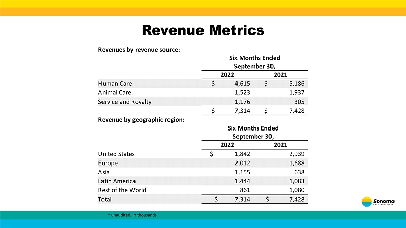 Revenue Metrics Revenues by revenue source: Six Months Ended September 30, 2022 2021 Human Care $ 4,615 $ 5,186 Animal Care 1,523 1,937 Service and Royalty 1,176 305 $ 7,314 $ 7,428 Revenue by geographic region: Six Months Ended September 30, 2022 2021 United States $ 1,842 2,939 Europe 2,012 1,688 Asia 1,155 638 Latin America 1,444 1,083 Rest of the World 861 1,080 Total $ 7,314 $ 7,428 * unaudited, in thousands