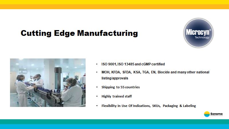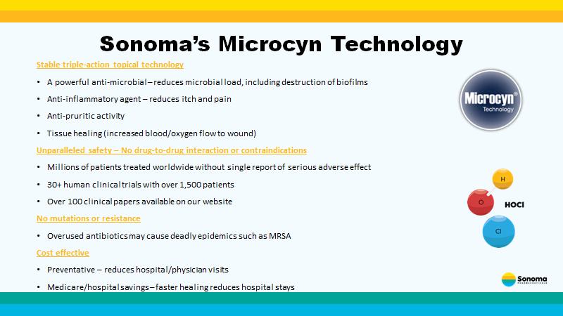 Sonoma’s Microcyn Technology Stable triple - action topical technology • A powerful anti - microbial – reduces microbial load, including destruction of biofilms • Anti - inflammatory agent – reduces itch and pain • Anti - pruritic activity • Tissue healing (increased blood/oxygen flow to wound) Unparalleled safety – No drug - to - drug interaction or contraindications • Millions of patients treated worldwide without single report of serious adverse effect • 30+ human clinical trials with over 1,500 patients • Over 100 clinical papers available on our website No mutations or resistance • Overused antibiotics may cause deadly epidemics such as MRSA Cost effective • Preventative – reduces hospital/physician visits • Medicare/hospital savings – faster healing reduces hospital stays