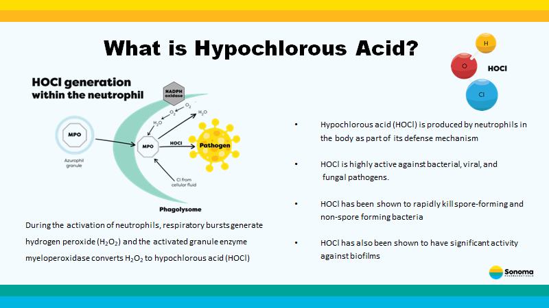 What is Hypochlorous Acid? During the activation of neutrophils, respiratory bursts generate hydrogen peroxide (H 2 O 2 ) and the activated granule enzyme myeloperoxidase converts H 2 O 2 to hypochlorous acid (HOCl) • Hypochlorous acid (HOCl) is produced by neutrophils in the body as part of its defense mechanism • HOCl is highly active against bacterial, viral, and fungal pathogens. • HOCl has been shown to rapidly kill spore - forming and non - spore forming bacteria • HOCl has also been shown to have significant activity against biofilms