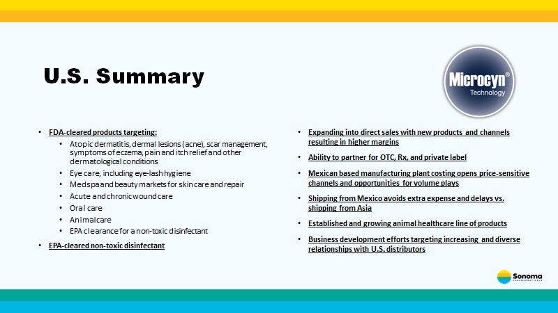 • FDA - cleared products targeting: • Atopic dermatitis, dermal lesions (acne), scar management, symptoms of eczema, pain and itch relief and other dermatological conditions • Eye care, including eye - lash hygiene • Medspa and beauty markets for skin care and repair • Acute and chronic wound care • Oral care • Animal care • EPA clearance for a non - toxic disinfectant • EPA - cleared non - toxic disinfectant • Expanding into direct sales with new products and channels resulting in higher margins • Ability to partner for OTC, Rx, and private label • Mexican based manufacturing plant costing opens price - sensitive channels and opportunities for volume plays • Shipping from Mexico avoids extra expense and delays vs. shipping from Asia • Established and growing animal healthcare line of products • Business development efforts targeting increasing and diverse relationships with U.S. distributors U.S. Summary