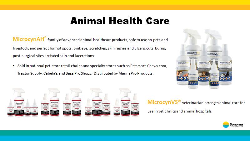 Animal Health Care MicrocynAH ® family of advanced animal healthcare products, safe to use on pets and livestock, and perfect for hot spots, pink eye, scratches, skin rashes and ulcers, cuts, burns, post - surgical sites, irritated skin and lacerations. • Sold in national pet - store retail chains and specialty stores such as Petsmart , Chewy.com, Tractor Supply, Cabela’s and Bass Pro Shops. Distributed by MannaPro Products. MicrocynVS ® veterinarian - strength animal care for use in vet clinics and animal hospitals.