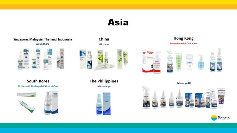 Asia Singapore, Malaysia, Thailand, Indonesia WoundCare South Korea BioDerm & Biodacyn60 Wound Care Hong K ong Microdacyn60 Oral Care China Microcyn The Philippines M icrodacyn MicrocynAH