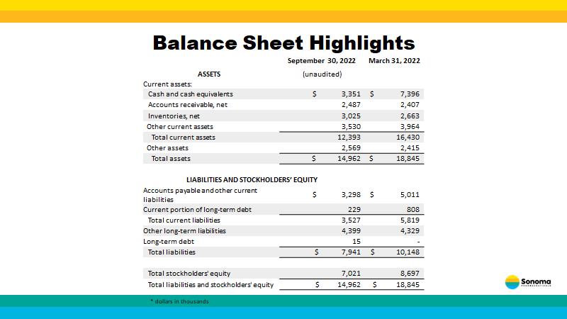 Balance Sheet Highlights September 30, 2022 March 31, 2022 ASSETS (unaudited) Current assets: Cash and cash equivalents $ 3,3 5 1 $ 7,396 Accounts receivable, net 2,487 2,407 Inventories, net 3,025 2,663 Other current assets 3,530 3,964 Total current assets 12,393 16,430 Other assets 2,569 2,415 Total assets $ 14,962 $ 18,845 LIABILITIES AND STOCKHOLDERS’ EQUITY Accounts payable and other current liabilities $ 3,298 $ 5,011 Current portion of long - term debt 229 808 Total current liabilities 3,527 5,819 Other long - term liabilities 4,399 4,329 Long - term debt 15 - Total liabilities $ 7,941 $ 10,148 Total stockholders' equity 7,021 8,697 Total liabilities and stockholders' equity $ 14,962 $ 18,845 * dollars in thousands