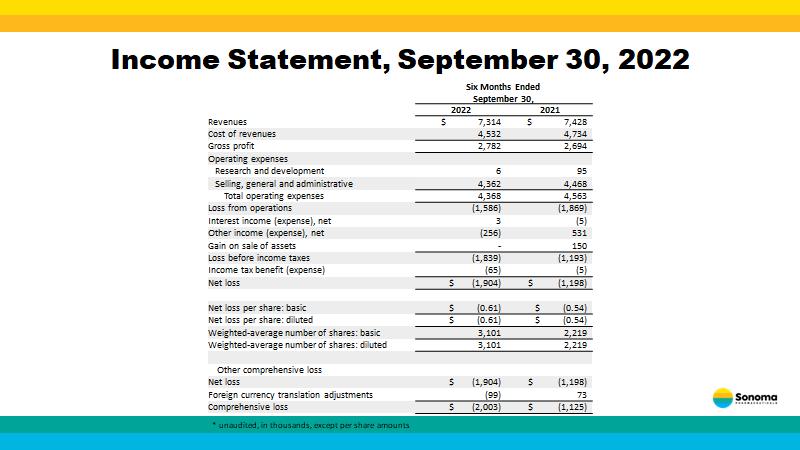 Income Statement, September 30, 2022 Six Months Ended September 30, 2022 2021 Revenues $ 7,314 $ 7,428 Cost of revenues 4,532 4,734 Gross profit 2,782 2,694 Operating expenses Research and development 6 95 Selling, general and administrative 4,362 4,468 Total operating expenses 4,368 4,563 Loss from operations (1,586) (1,869) Interest income (expense), net 3 (5) Other income (expense), net (256) 531 Gain on sale of assets - 150 Loss before income taxes (1,839) (1,193) Income tax benefit (expense) (65) (5) Net loss $ (1,904) $ (1,198) Net loss per share: basic $ (0.61) $ (0.54) Net loss per share: diluted $ (0.61) $ (0.54) Weighted - average number of shares: basic 3,101 2,219 Weighted - average number of shares: diluted 3,101 2,219 Other comprehensive loss Net loss $ (1,904) $ (1,198) Foreign currency translation adjustments (99) 73 Comprehensive loss $ (2,003) $ (1,125) * unaudited, in thousands, except per share amounts