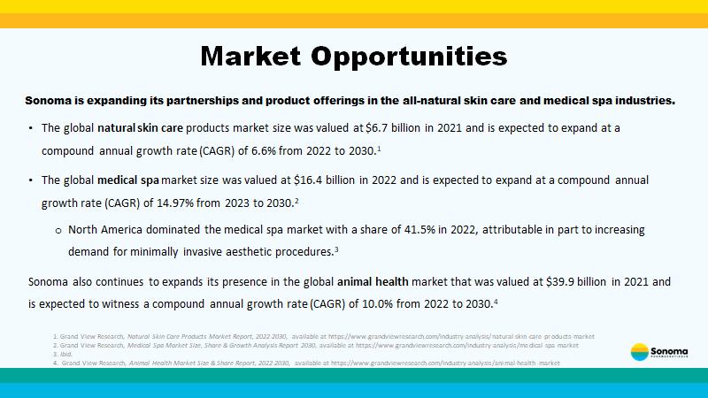 • The global natural skin care products market size was valued at $6.7 billion in 2021 and is expected to expand at a compound annual growth rate (CAGR) of 6.6% from 2022 to 2030. 1 • The global medical spa market size was valued at $16.4 billion in 2022 and is expected to expand at a compound annual growth rate (CAGR) of 14.97% from 2023 to 2030. 2 o North America dominated the medical spa market with a share of 41.5% in 2022, attributable in part to increasing demand for minimally invasive aesthetic procedures. 3 • Sonoma also continues to expands its presence in the global animal health market that was valued at $39.9 billion in 2021 and is expected to witness a compound annual growth rate (CAGR) of 10.0% from 2022 to 2030. 4 Market Opportunities Sonoma is expanding its partnerships and product offerings in the all - natural skin care and medical spa industries. 1. Grand View Research, Natural Skin Care Products Market Report, 2022 - 2030 , available at https://www.grandviewresearch.com/industry - analysis/natural - skin - care - products - market 2. Grand View Research, Medical Spa Market Size, Share & Growth Analysis Report 2030 , available at https://www.grandviewresearch.com/industry - analysis/medical - spa - market 3. Ibid. 4. Grand View Research, Animal Health Market Size & Share Report, 2022 - 2030 , available at https://www.grandviewresearch.com/industry - analysis/animal - health - market
