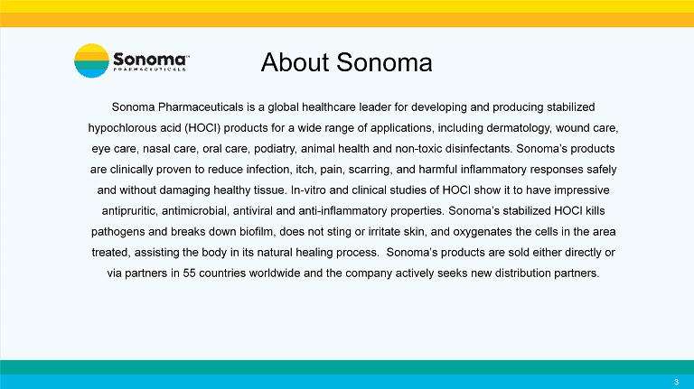 Sonoma Pharmaceuticals is a global healthcare leader for developing and producing stabilized hypochlorous acid ( HOCl ) products for a wide range of applications, including dermatology, wound care, eye care, nasal care, oral care, podiatry, animal health and non - toxic disinfectants. Sonoma’s products are clinically proven to reduce infection, itch, pain, scarring, and harmful inflammatory responses safely and without damaging healthy tissue. In - vitro and clinical studies of HOCl show it to have impressive antipruritic, antimicrobial, antiviral and anti - inflammatory properties. Sonoma’s stabilized HOCl kills pathogens and breaks down biofilm, does not sting or irritate skin, and oxygenates the cells in the area treated, assisting the body in its natural healing process. Sonoma’s products are sold either directly or via partners in 55 countries worldwide and the company actively seeks new distribution partners. About Sonoma 3