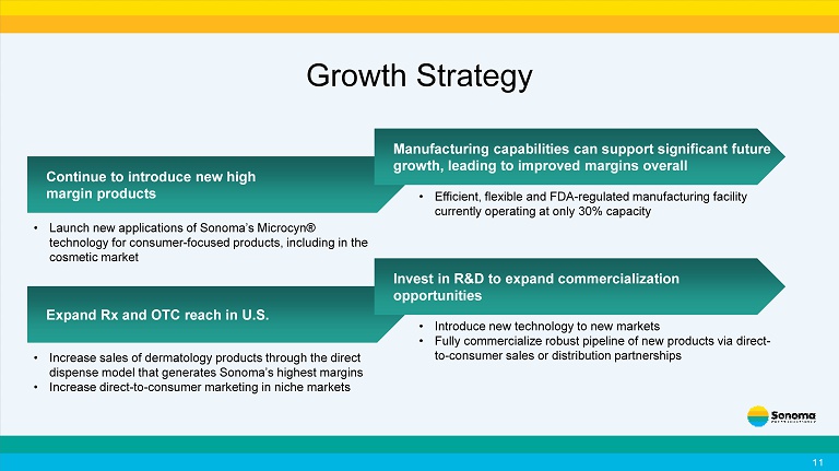 Robust International Distribution Network OVER 40 GLOBAL PARTNERS generating strong revenues internationally and in the U.S. • Expand presence in new markets by replicating what works in existing markets • Continue to add new distribution partners and grow existing relationships • Continue co - development of innovative new products with partners in the U.S. and internationally • Work with partners to seek new approvals and certifications 10