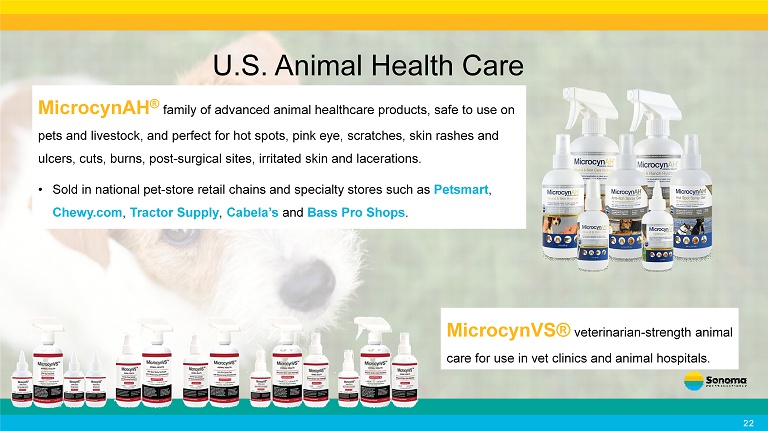 U.S. Animal Health Care MicrocynAH ® family of advanced animal healthcare products, safe to use on pets and livestock, and perfect for hot spots, pink eye, scratches, skin rashes and ulcers, cuts, burns, post - surgical sites, irritated skin and lacerations. • Sold in national pet - store retail chains and specialty stores such as Petsmart , Chewy.com , Tractor Supply , Cabela’s and Bass Pro Shops . MicrocynVS® veterinarian - strength animal care for use in vet clinics and animal hospitals. 22